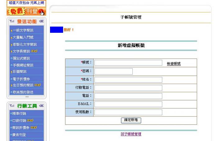 | (2)修改子帳號(可修改子帳號資料/密碼重新設定與使用點數) | ||||||