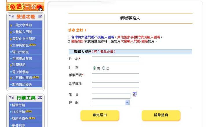 --新增聯絡人(大量新增,提供檔案資料匯入 ) 操作者可透過編輯CSV檔進行大量聯絡人上傳。 CSV檔所需欄位資料包含姓名、行動電話、性別、E-Mail、生日等 |