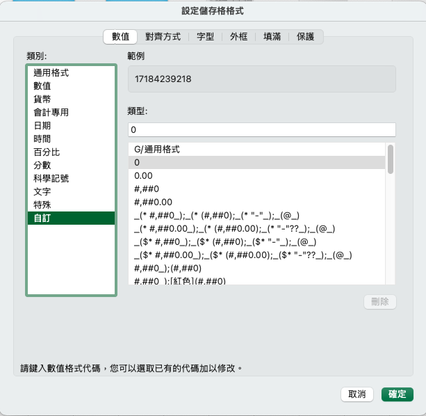 1. 用Excel 編輯時,請確認將電話號碼欄位的儲存格式設為自訂(類型:0)設定方式範例